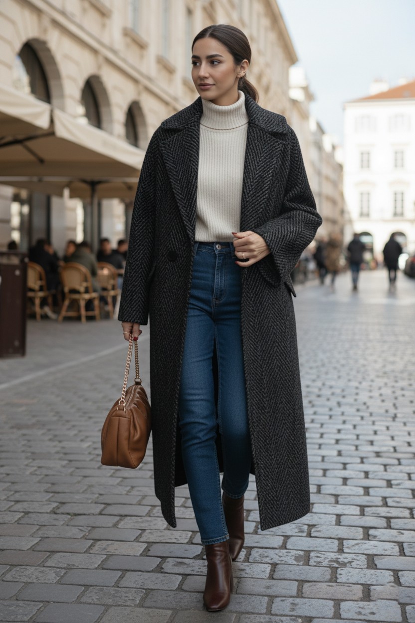 • Balık Sırtı Desenli Astarlı Kışlık Kadın Uzun  Kaşmir Kaban