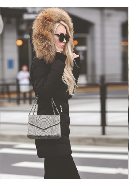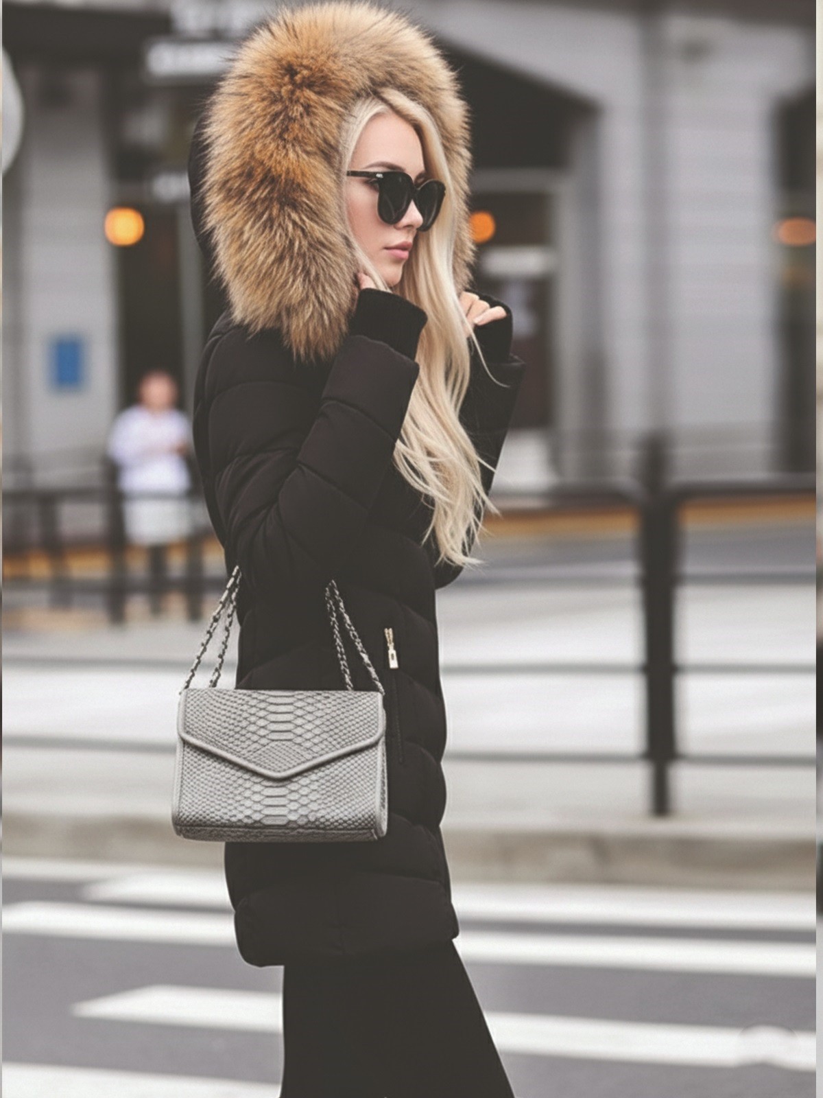 • Eldiven Detaylı Siyah Kapüşonlu Orta boy Kürklü Şişme Mont