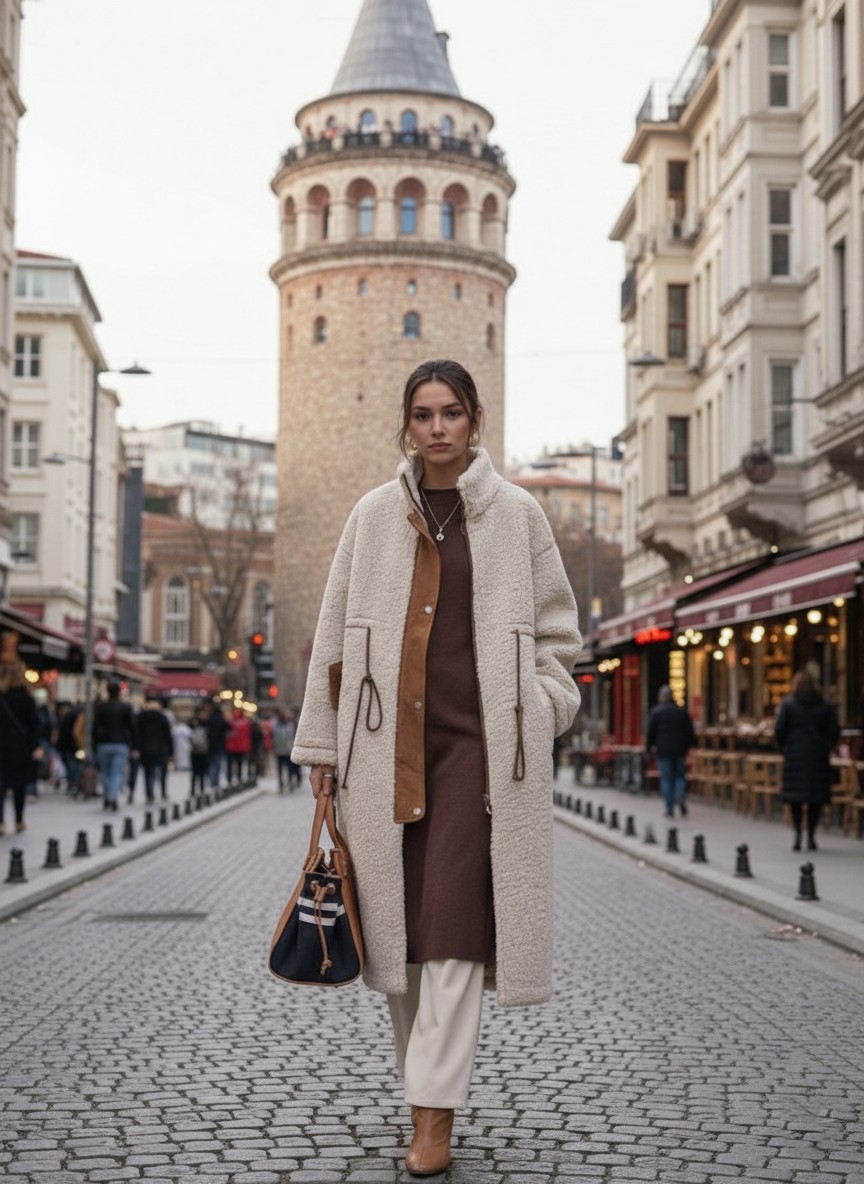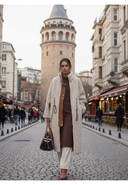 • Kadın Peluş Beli Bağcıklı Kışlık Fermuarlı Ceket co02krem