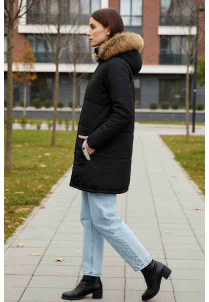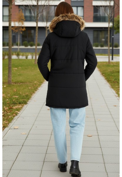 • Kadın Yakası Suni Kürklü Tasarım Şişme Siyah Mont