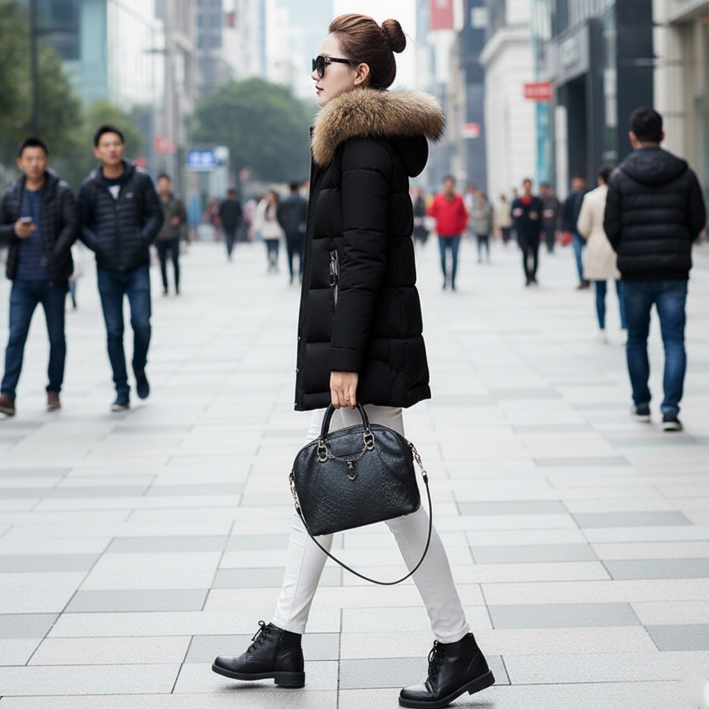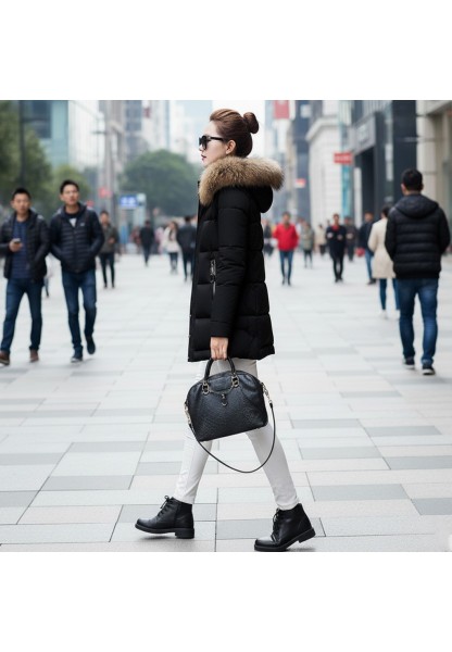 • Kadın Tasarım Yakası Suni Kürklü Siyah Şişme Mont