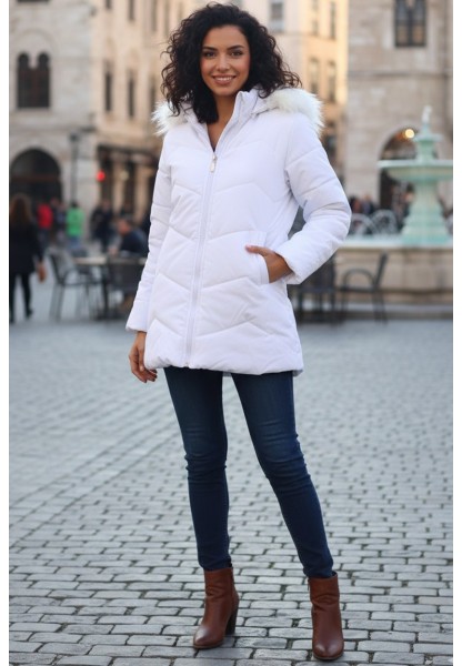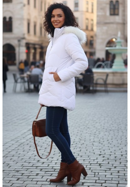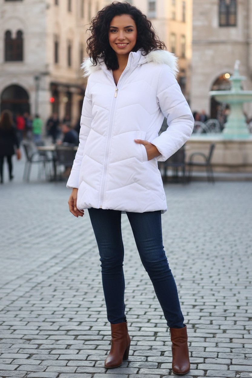 Günlük Kışlık Kapişonu Kürklü Kadın Şişme Beyaz Mont