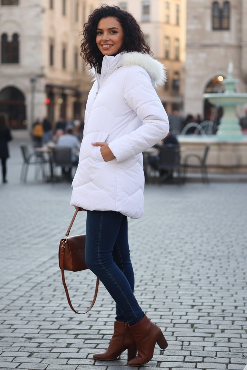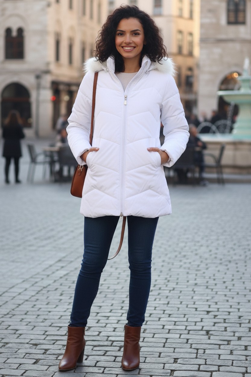 • Günlük Kışlık Kapişonu Kürklü Kadın Şişme Beyaz Mont