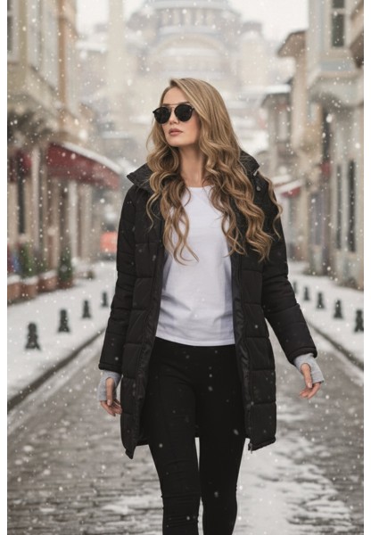 • Kapüşonlu Eldiven Detaylı Kışlık Kadın Şişme Mont