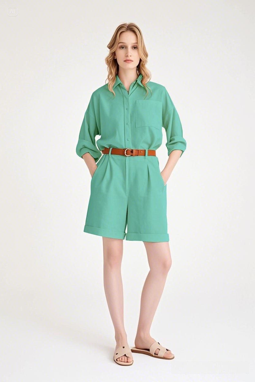 Uzun Kol Keten Gömlek Şort İkili Su Yeşili Takım